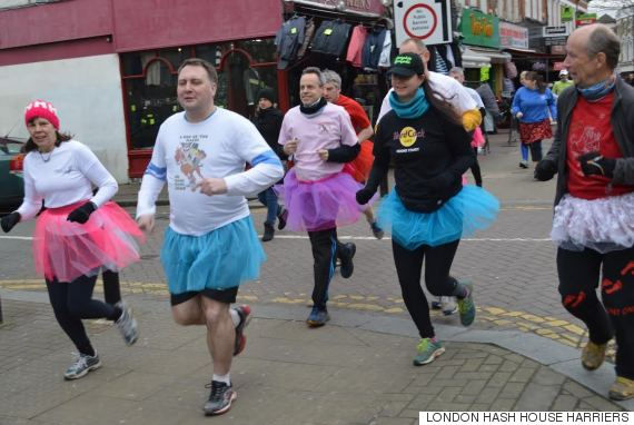 The London Hash House Harriers hold weekly events. They currently run on weekends, meeting at noon. In the summer they run on Monday evenings, meeting at 7 PM. Each trail is from a different location, all accessible by tube or train. Their trails go through a variety of terrains, followed by plenty of drinking and socialising.